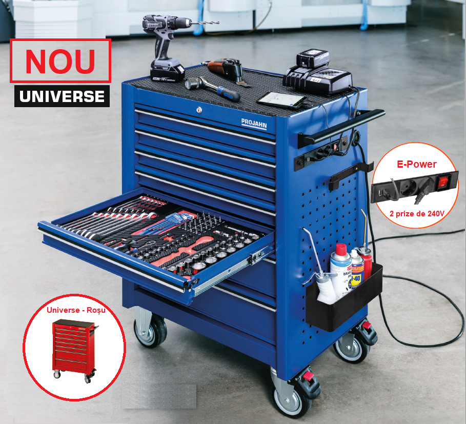 Noul cărucior pentru atelier UNIVERSE este special prin funcția sa practică și inovatoare E-Power care permite conectarea mobilă a laptopurilor, încărcătoarelor sau a instrumentelor electrice la locul de utilizare.