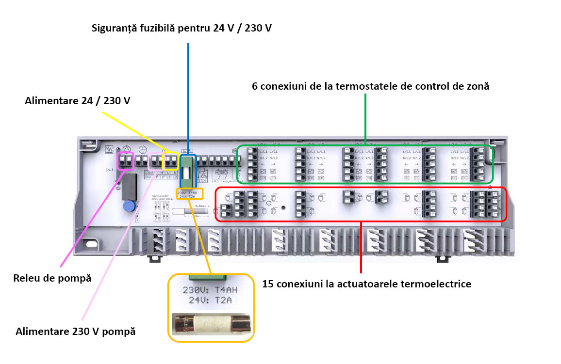 - unitatea de comandă (“regleta de conectare”), care poate fi la 230 V sau la 24 V + transformator